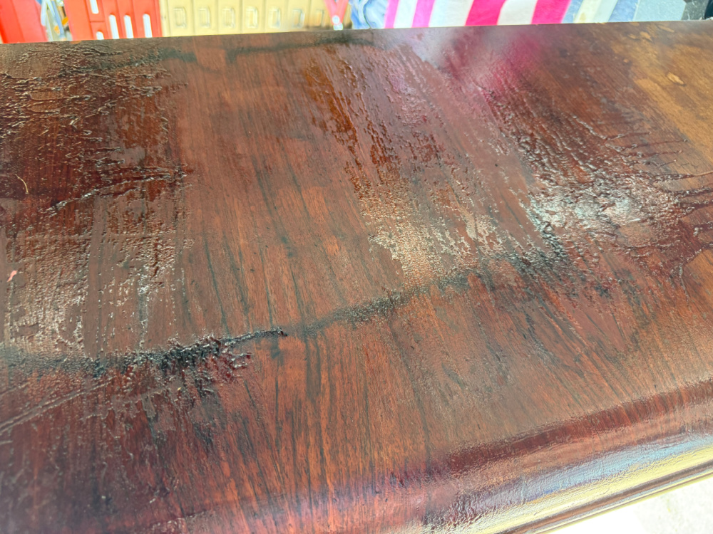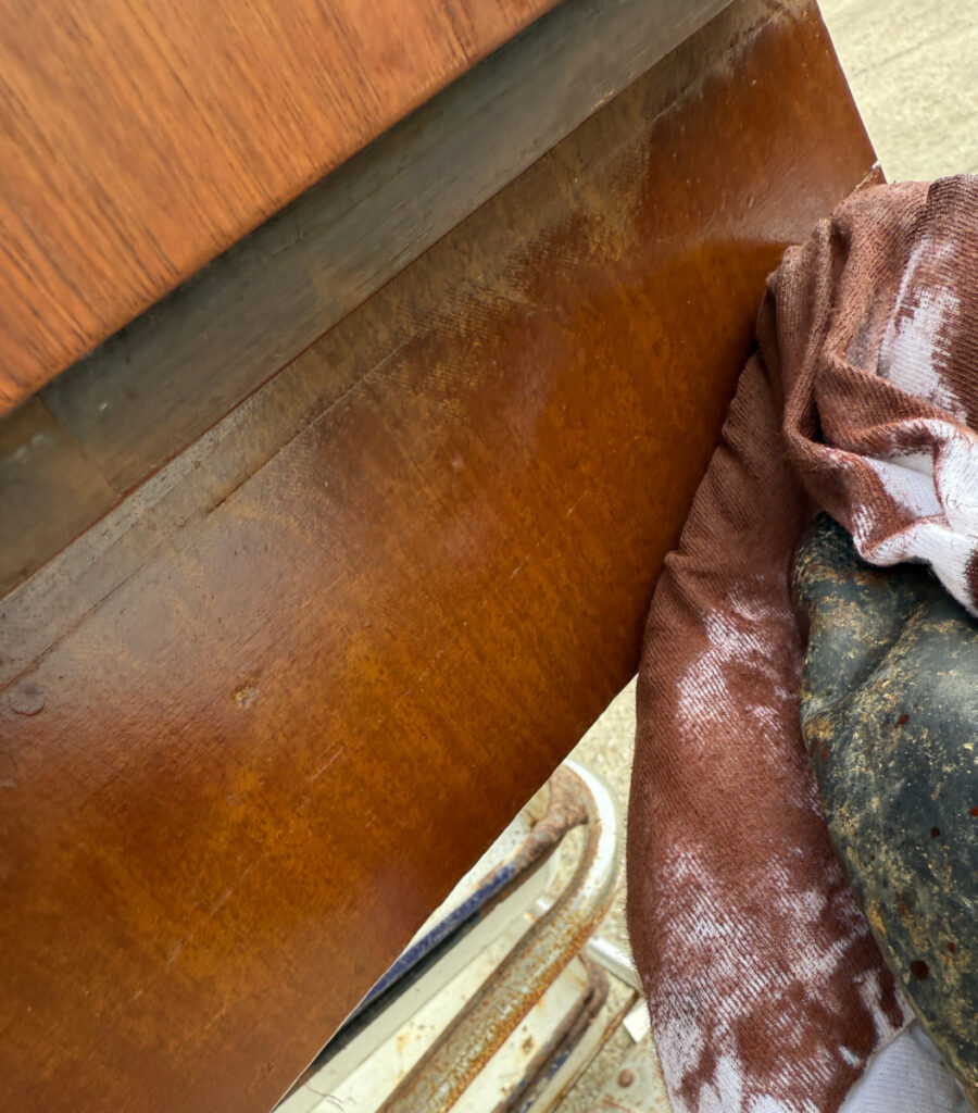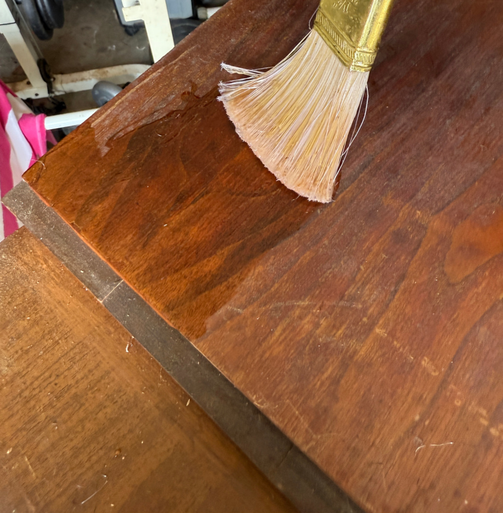 Once the stripping is completed, give the piece a wipe down with warm soapy water and repeat with tsp to prep the wood to receive the new stain.