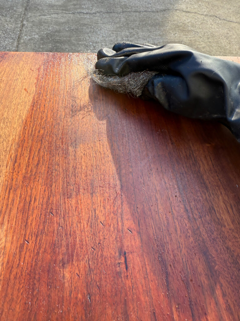 I start with a coarse steel wool and progress to a fine steel wool. In steel wool lingo, a bigger number means a coarser steel wool. So 200 is finer than 60.