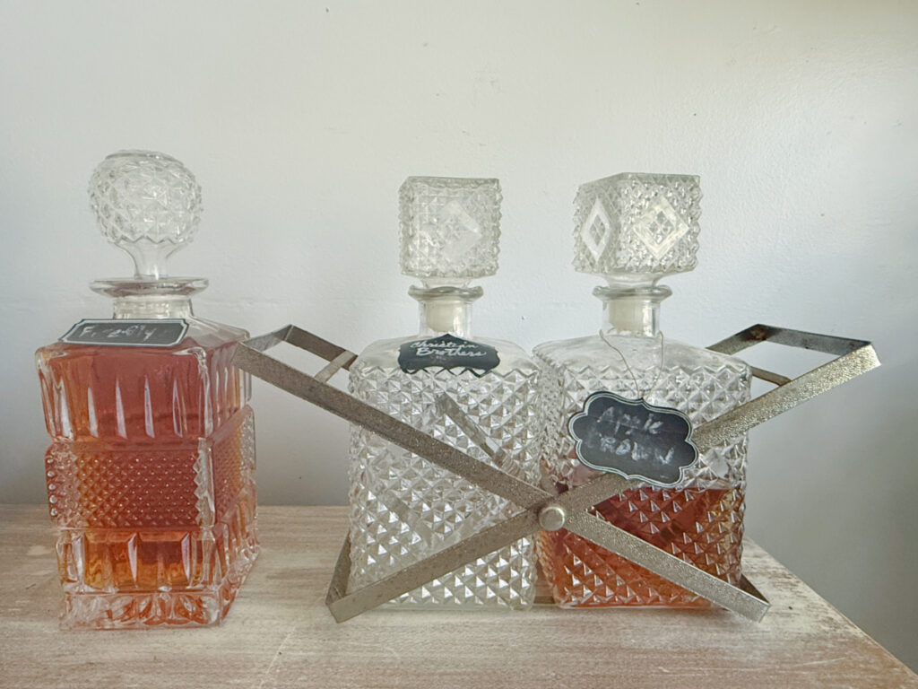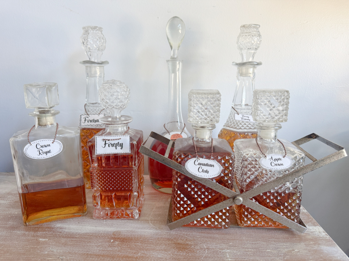 So last year, I dug out the glass and crystal decanters that were stored in the buffet, boxes, and closets around the house. I had collected these when I had my antiques and consignment store, The Blue Building. The decanters were some of the items I decided not to part with so they were in boxes in the garage.