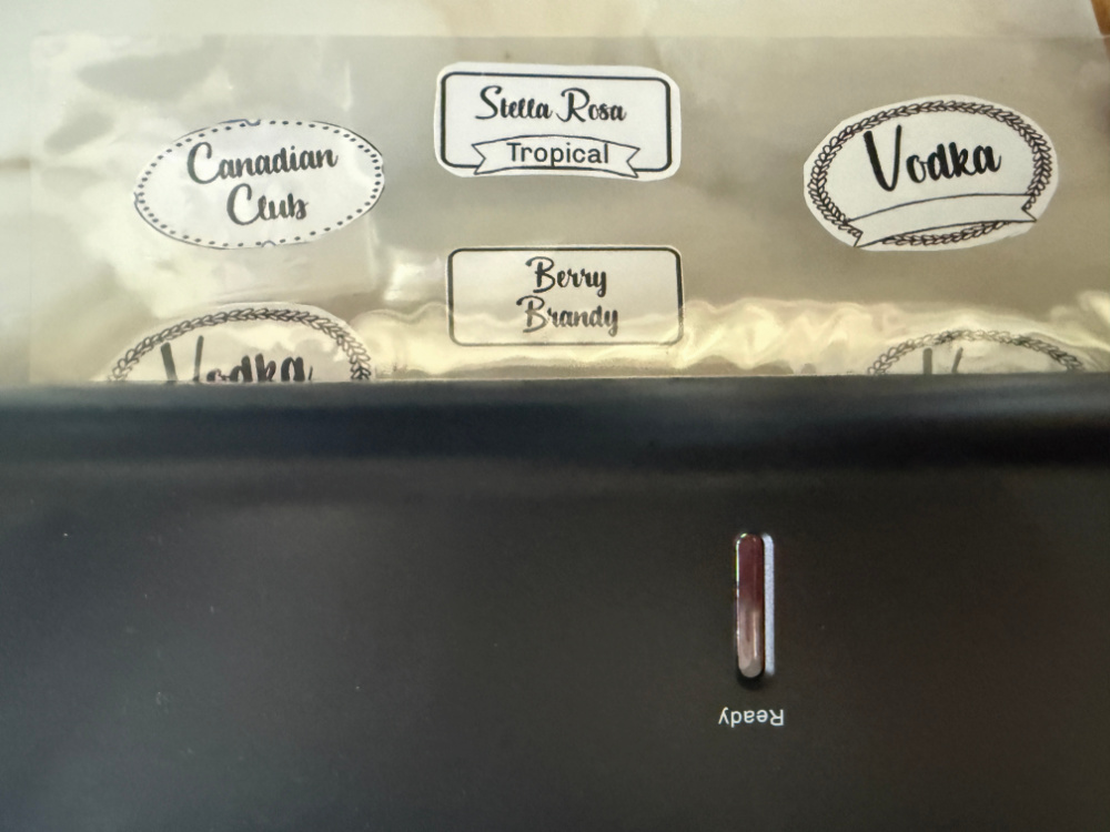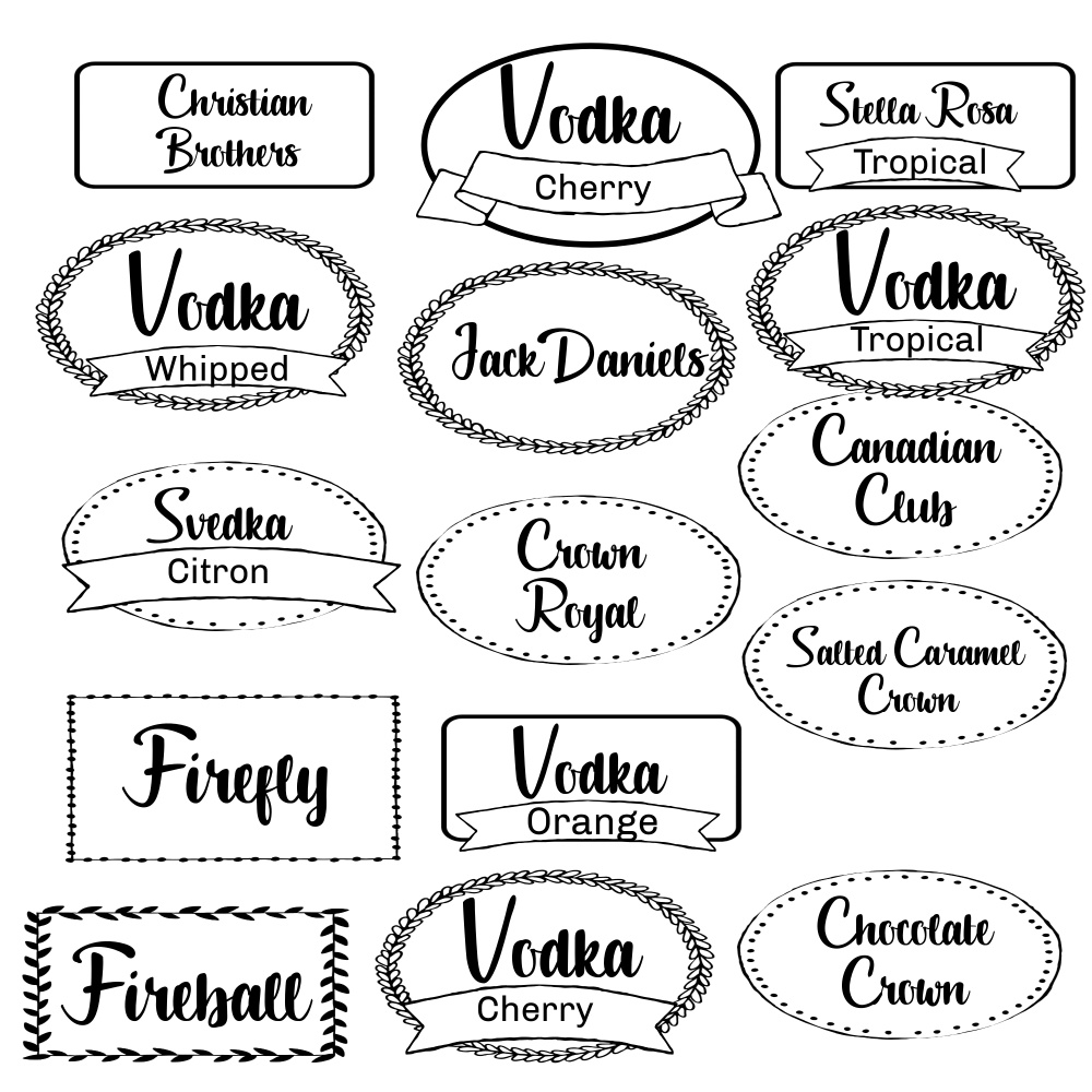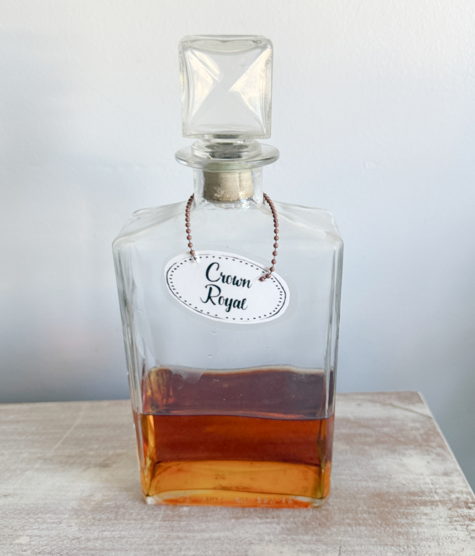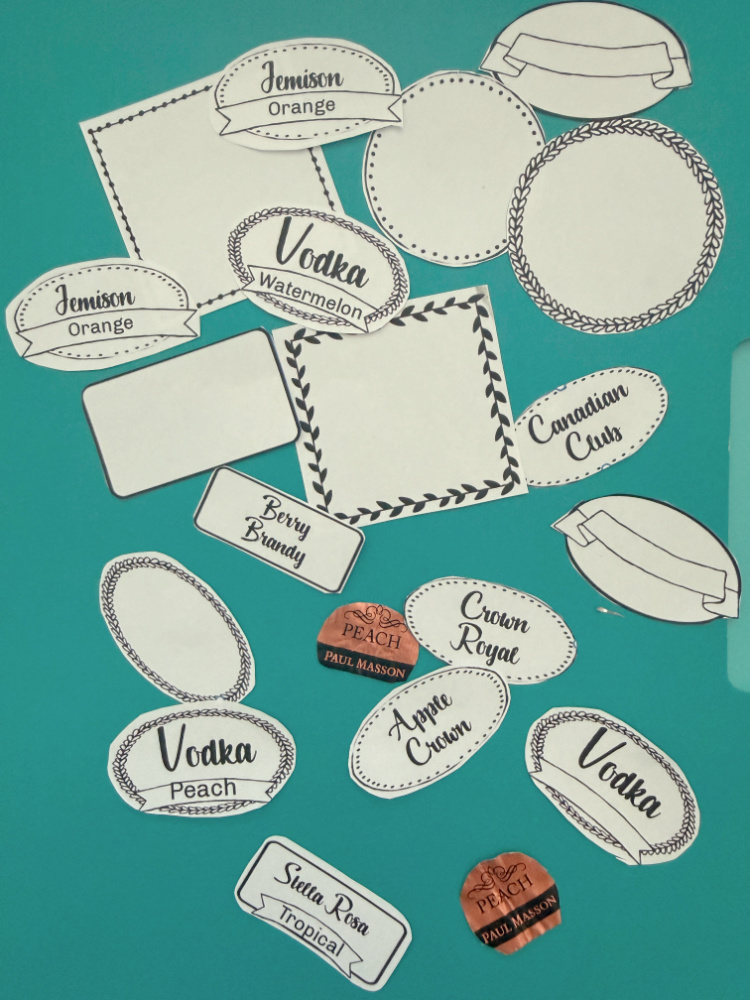 I decided to store the more commonly enjoyed liquors in the decanters. Specialty selections would stay in their original bottles on the shelf. As you can see, my first attempt at creating labels didn’t go so well.