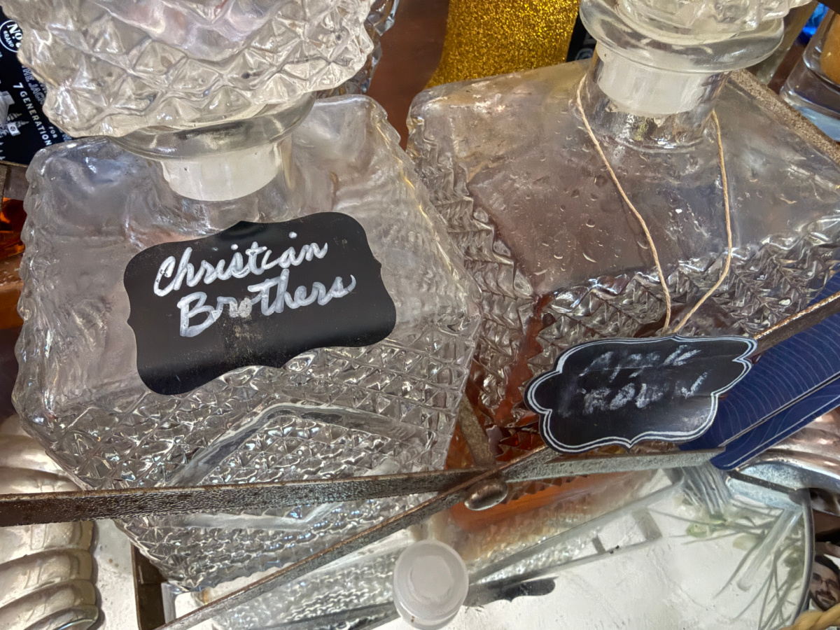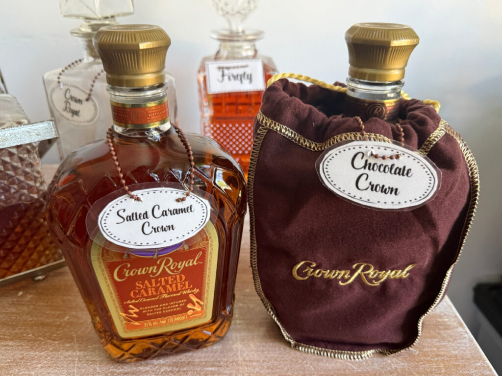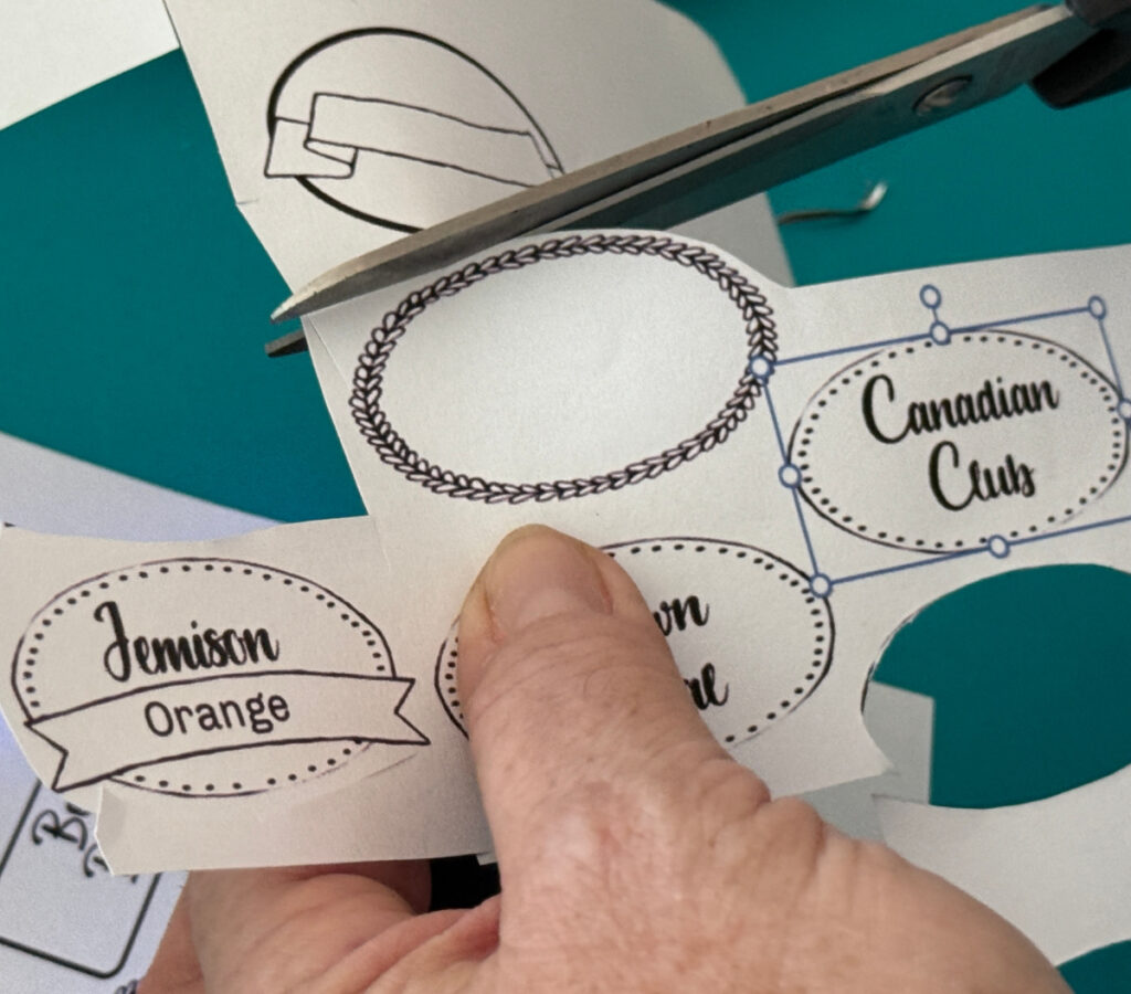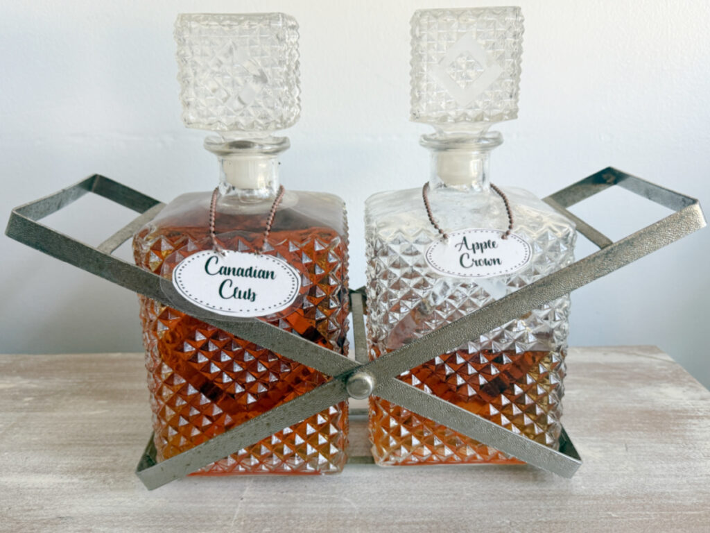 I decided to store the more commonly enjoyed liquors in the decanters. Specialty selections would stay in their original bottles on the shelf. As you can see, my first attempt at creating labels didn’t go so well.