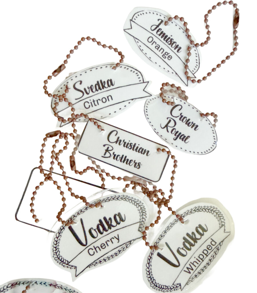 I checked out the price of actual tags on Amazon and found the average price to be around $20 for 6 tags. They had liquor tags made of metal, in silver, and gold, liquor sticker labels, a nice little variety. That could get pricey with the small but varied selection on our bar top. Isn’t that why we DIY? So, I will make some DIY liquor bottle tags.