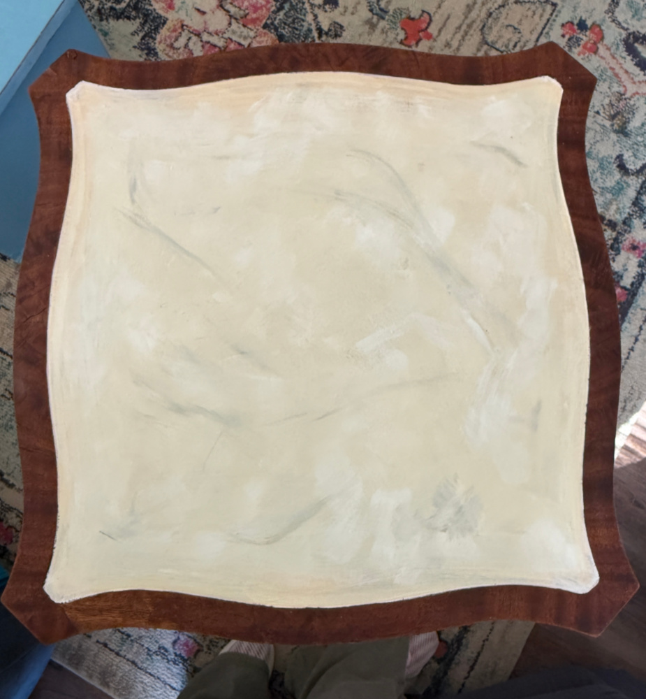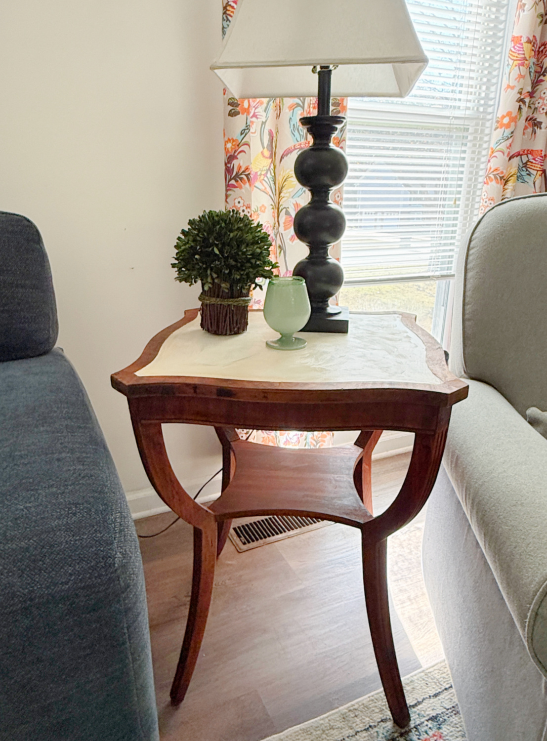 I grabbed this 1950’s thrift store mahogany side table some time ago for $5. She’s been sitting quietly in my garage since I closed The Blue Building Antiques and Consignment in 2019. She’s been very patient and when I was digging out the camping gear a week ago, she winked at me. How could I not move her to the front of the line?!