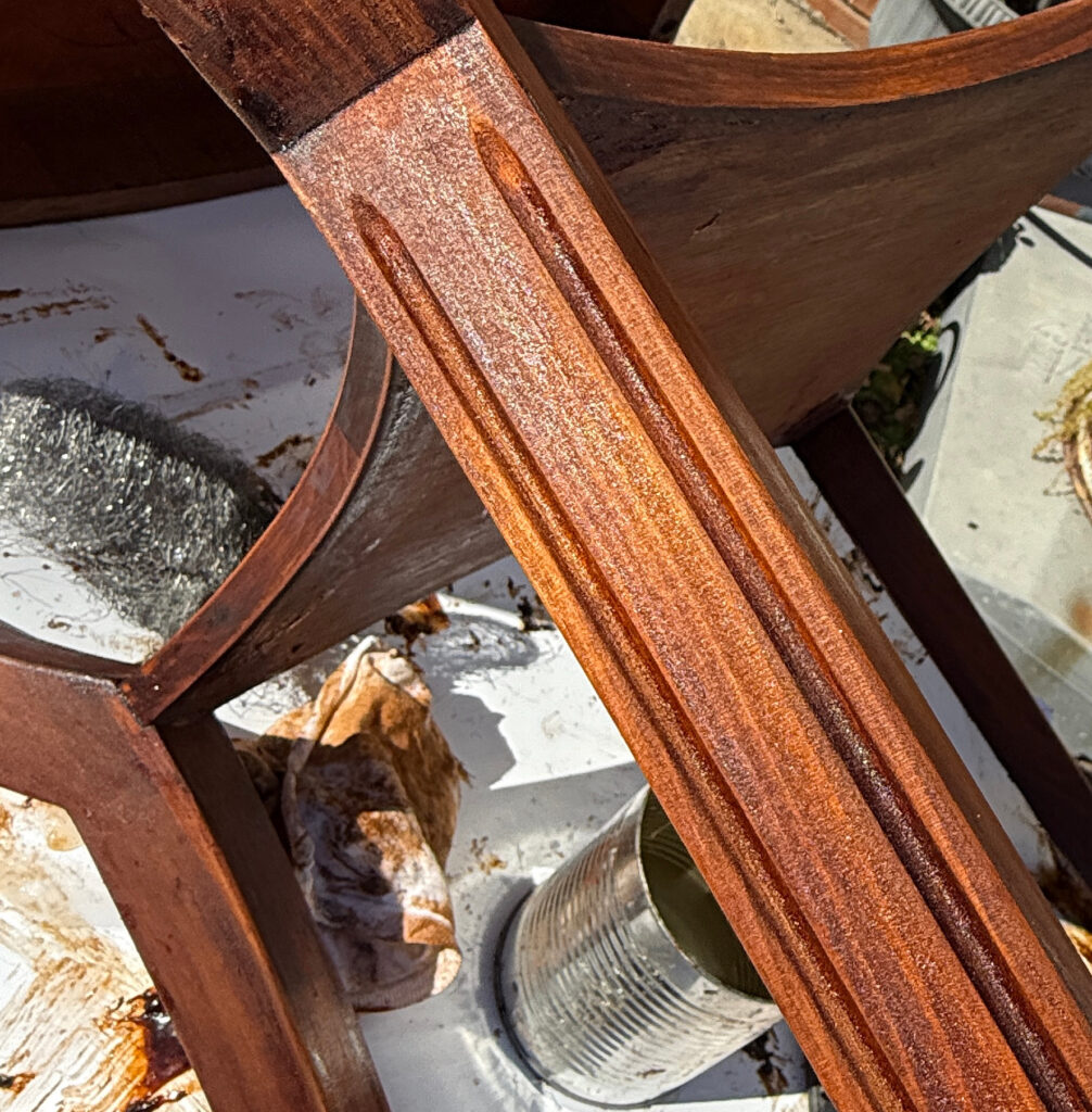 As I proceeded through the stripping process, I actually liked the stained wood beneath the thick old top coat. I decided NOT to re-stain, but rather leave the wood as is. This provided a lighter wood color and the existing stain really brought out the beauty of the mahogany wood. So I simply sealed the wood after the oldest top stain had been mostly removed. In this process, I removed the old gummy stain. But I stopped shy of completely stripping ALL of the stain from the wood. The wood was so beautiful.