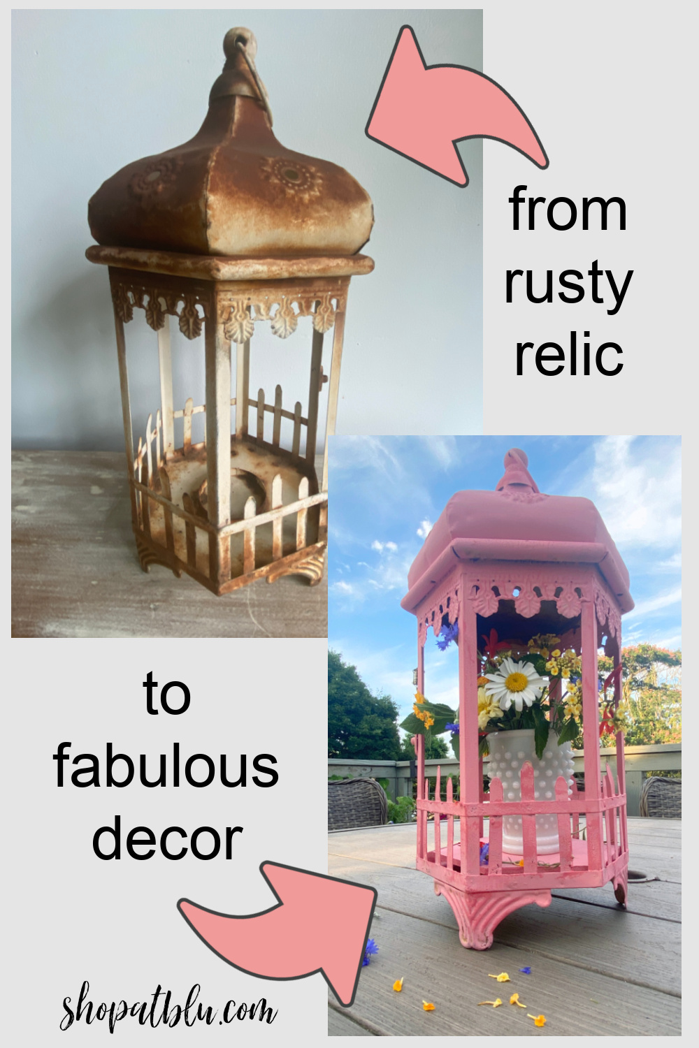 Anyway, when I see something that reminds me of my childhood, I grab it. I have the perfect paint to transform this metal garden decor lantern treasure that has seen better days.